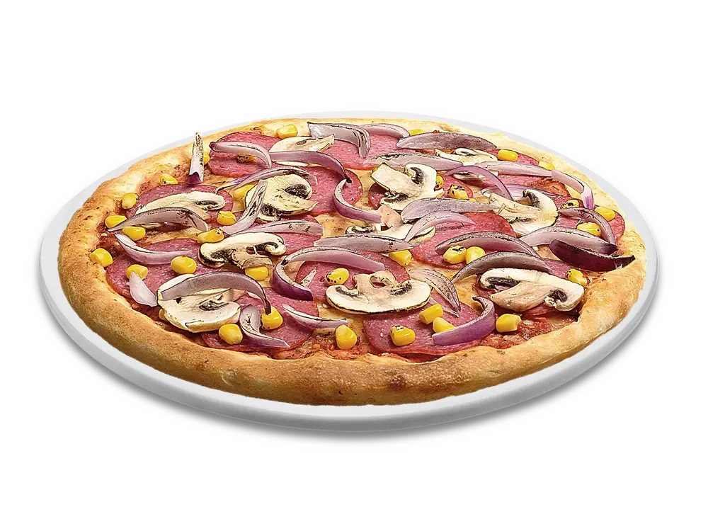 Frischer Teig, Tomatensauce, echter Käse, Salami(Pute), Zwiebeln, Mais, frische Champignons